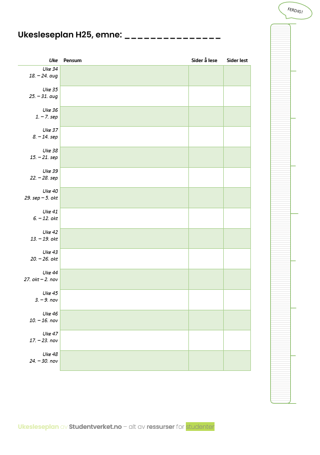 Du har allerede sett pensumoversikten, men hvis du foretrekker en oversikt som er basert på planlegging per uke kan du laste ned denne ukeleseplanen for høst 24. Hvis jeg har glemt å oppdatere denne til nåværende semester, bare send meg en mail så skal jeg lage en ny en. Denne har også en fremdriftsmåler!